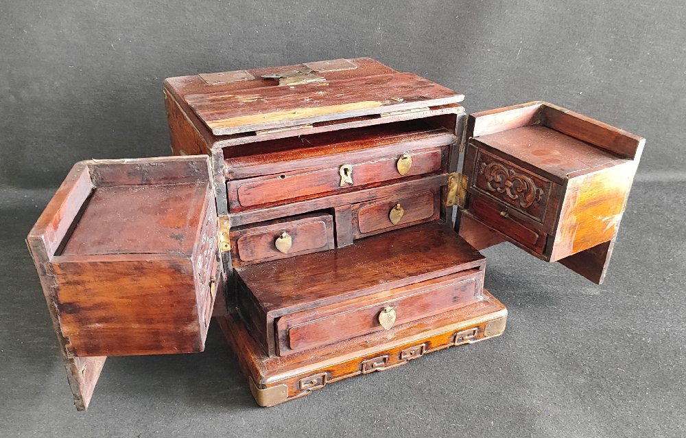 19th C. Asian miniature cabinet with drawers and hinged folding top and front, brass mounts and carry handles, 30 x 24cm