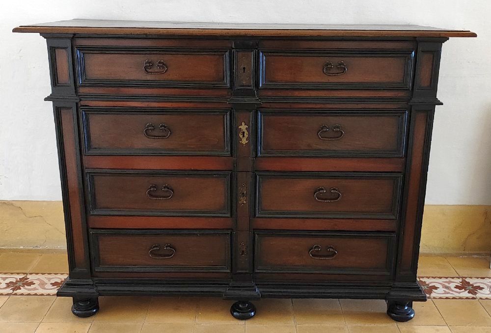 Late 18th C. Maltese chestnut chest of 4 drawers with panelled fronts and sides, ebonised profiles and 5 bun feet, 158 x 114 x 63cm