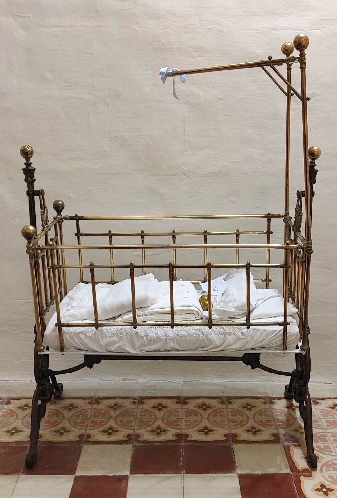 Victorian brass and cast iron cot on swing frame complete with its muslin and cotton drapes