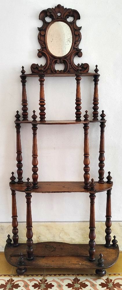 Victorian mahogany 4-tier semi circular whatnot on turned columns, 75cm