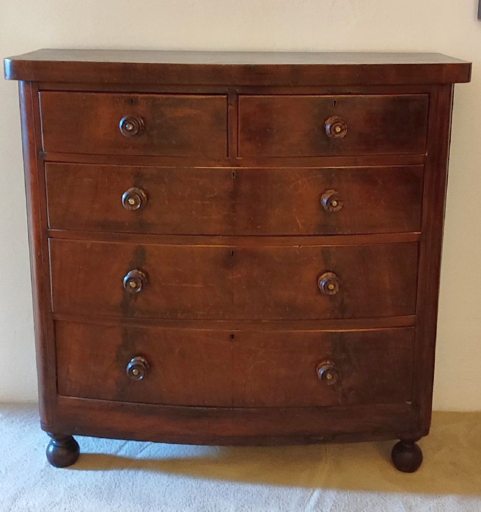 Victorian mahogany bow front chest of drawers having trompe l’oeuil painted knobs, 120 x 118cm