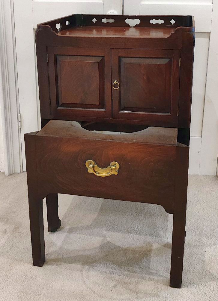 Geo IV mahogany chamber pot cupboard with raised gallery, extending drawer