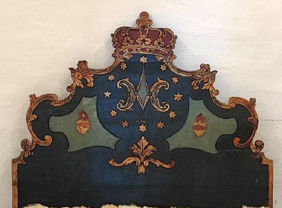 18th C. Maltese polychrome decorated bed head with crown and symbols o0f the Virgin Mary, 142 x 108cm
