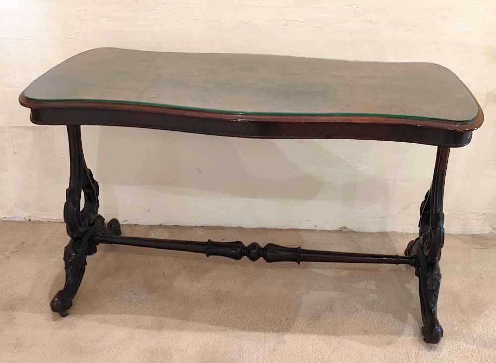 Victorian burr walnut sofa table on carved harp shape supports and scroll feet, plate glass top, 121cm