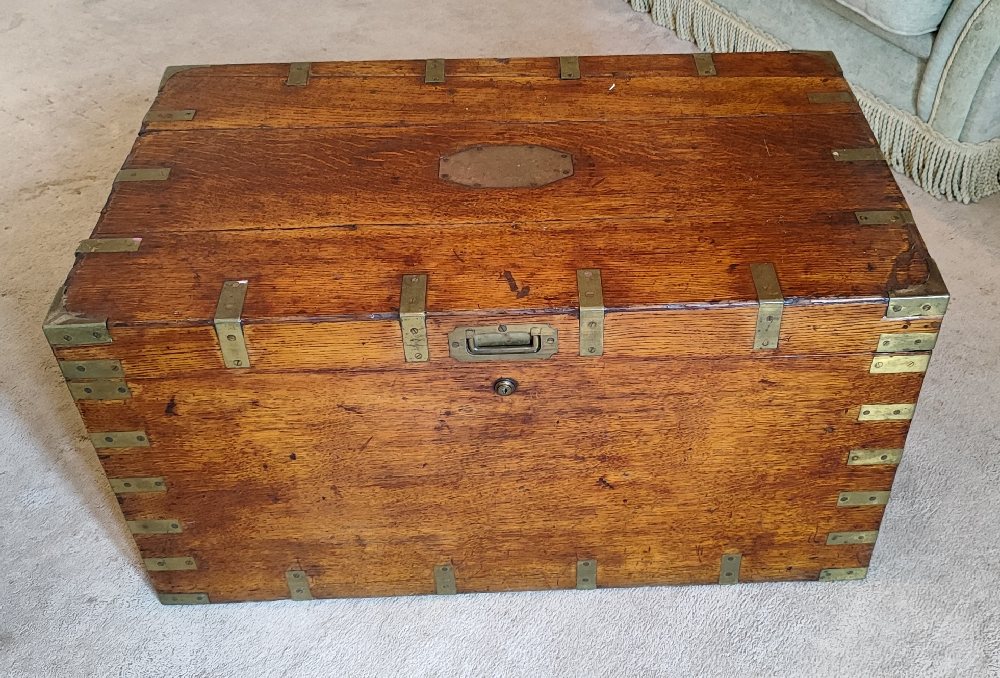 Mid 19th C. oak marine chest by W BENSON, London, with brass corners, 86 x 50 x 45cm