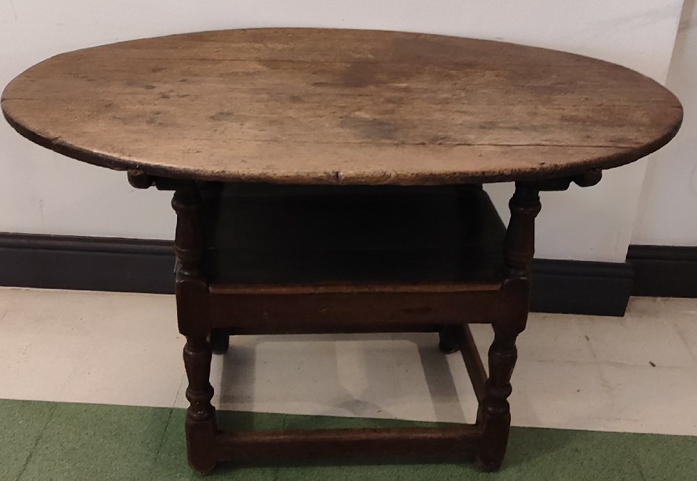 18th C. oak settle bench / table, oval top, 125cm