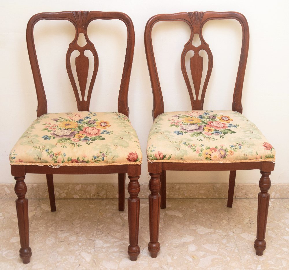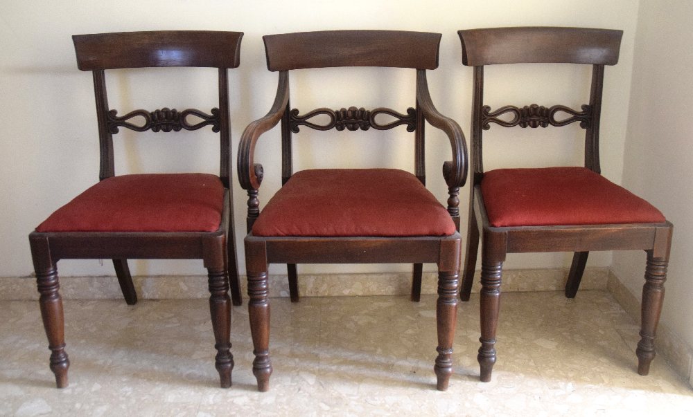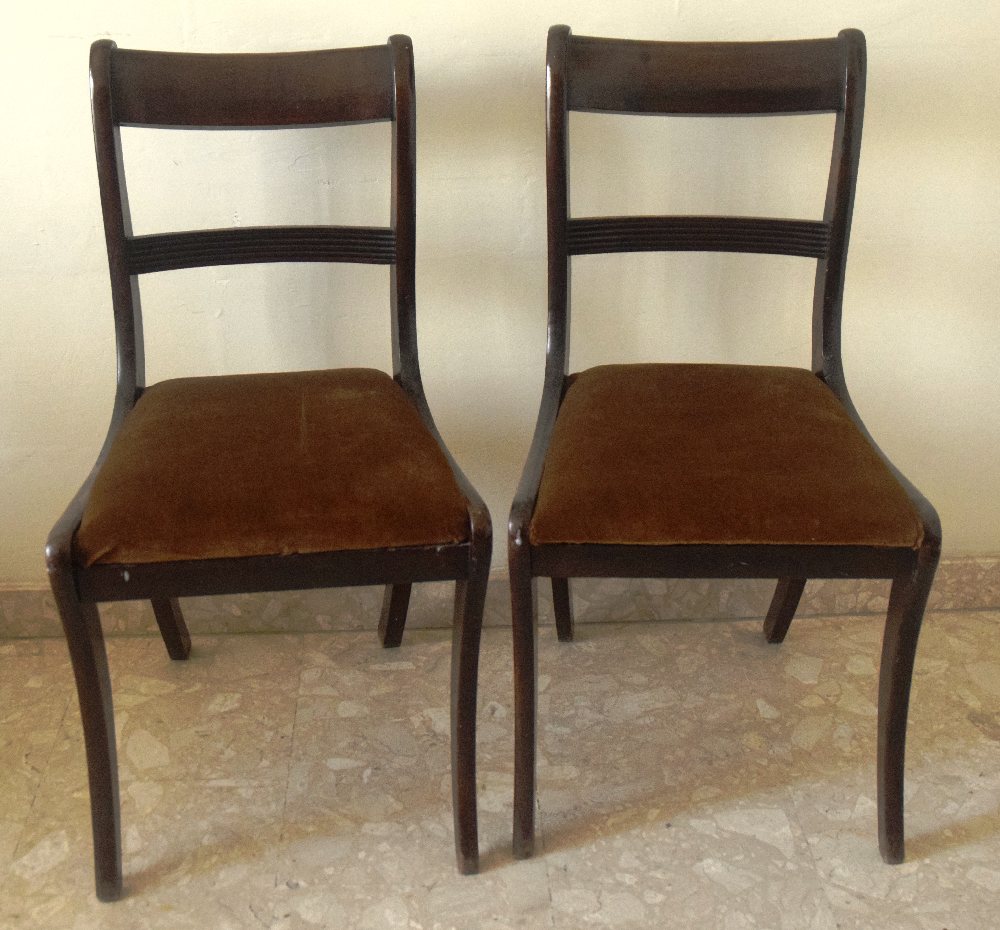 2, Mid 19th C. Mahogany sabre leg dining chairs, drop in upholstered seats