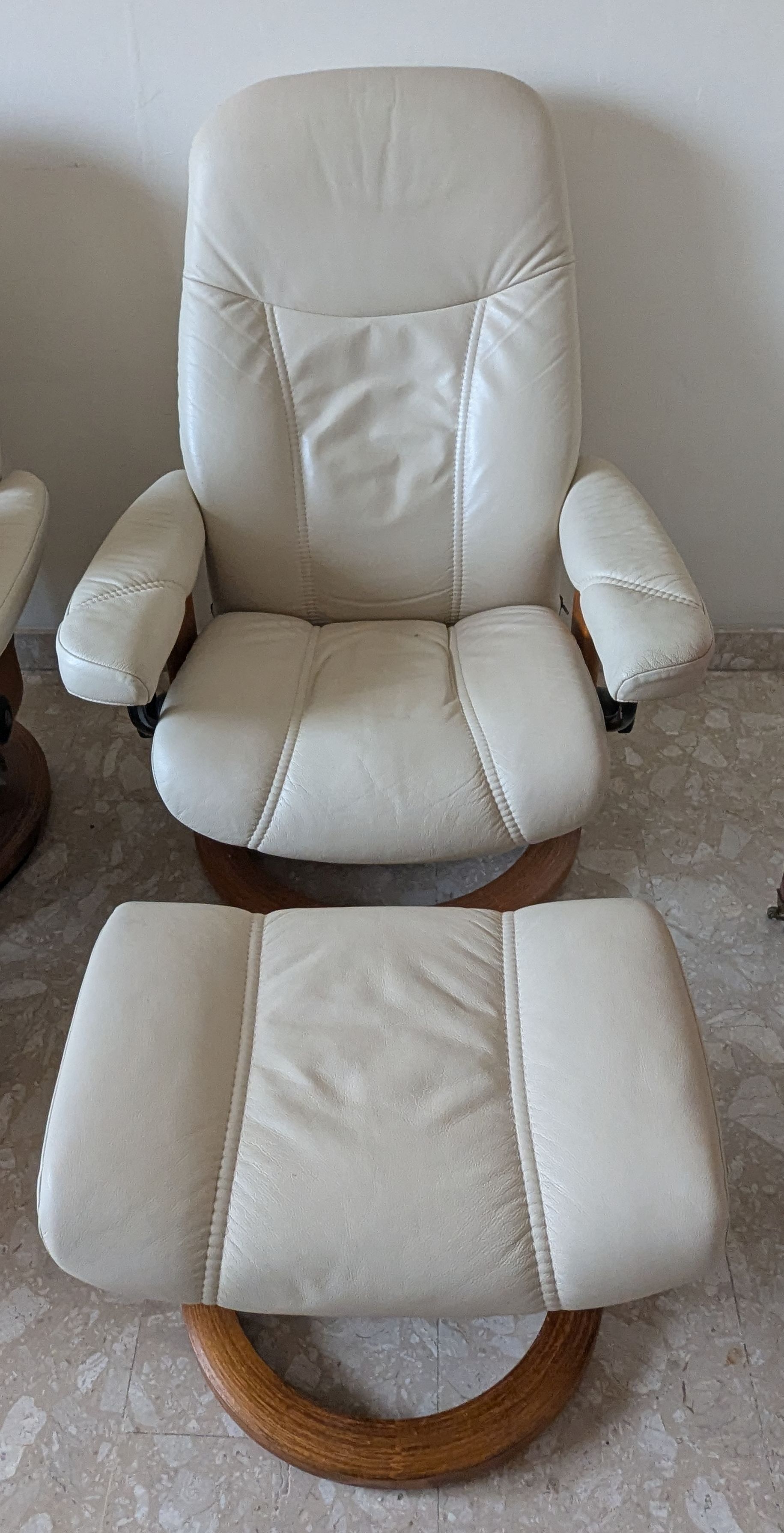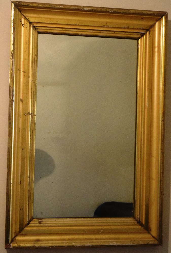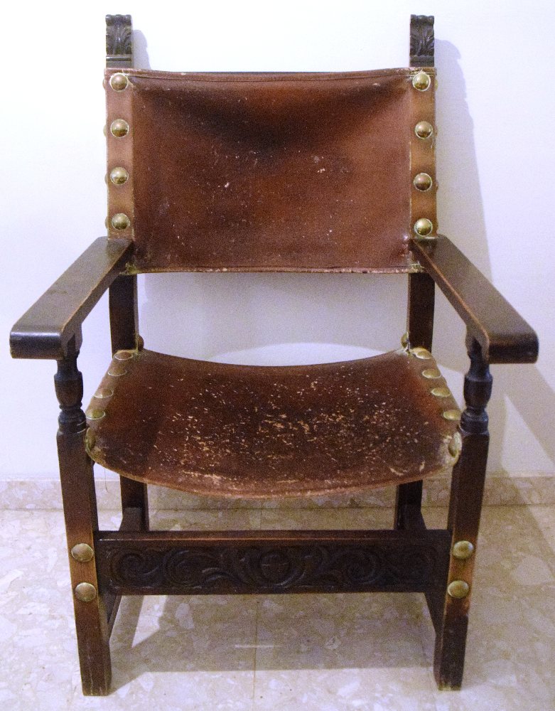 Old mahogany hall armchair with leather seat and back, brass buttons