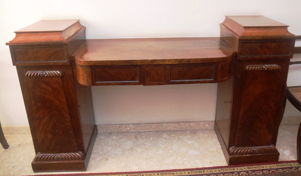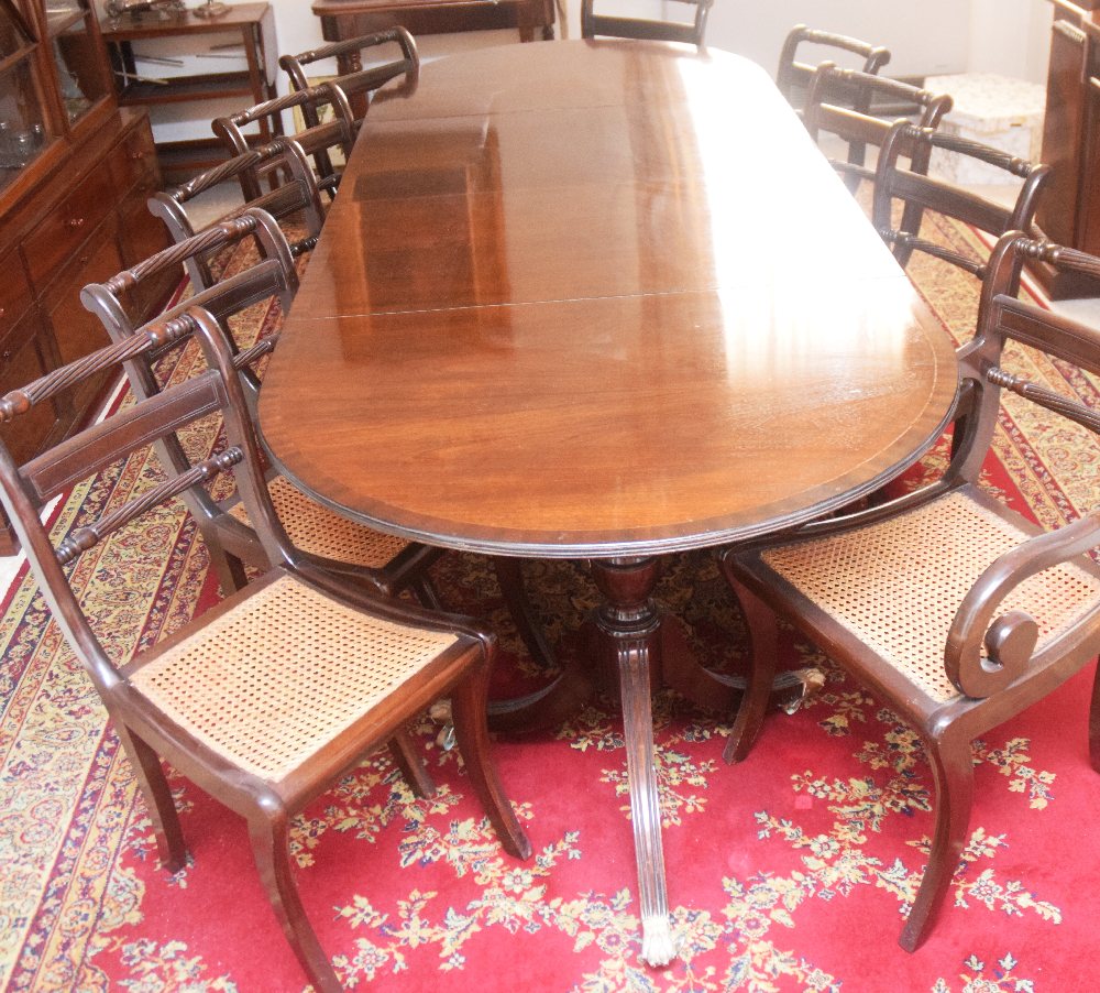 REPRODUX regency mahogany twin pedestal dining table, 106 x 152cm (275cm fully extended) and 8 chairs and pair carvers