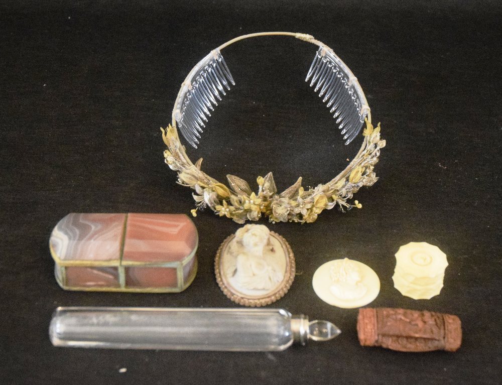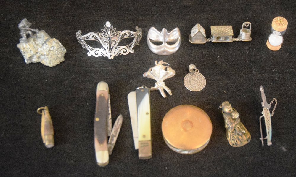 3 Miniature pen knives, pill box, Venetian masks, and 6 miniature ornaments