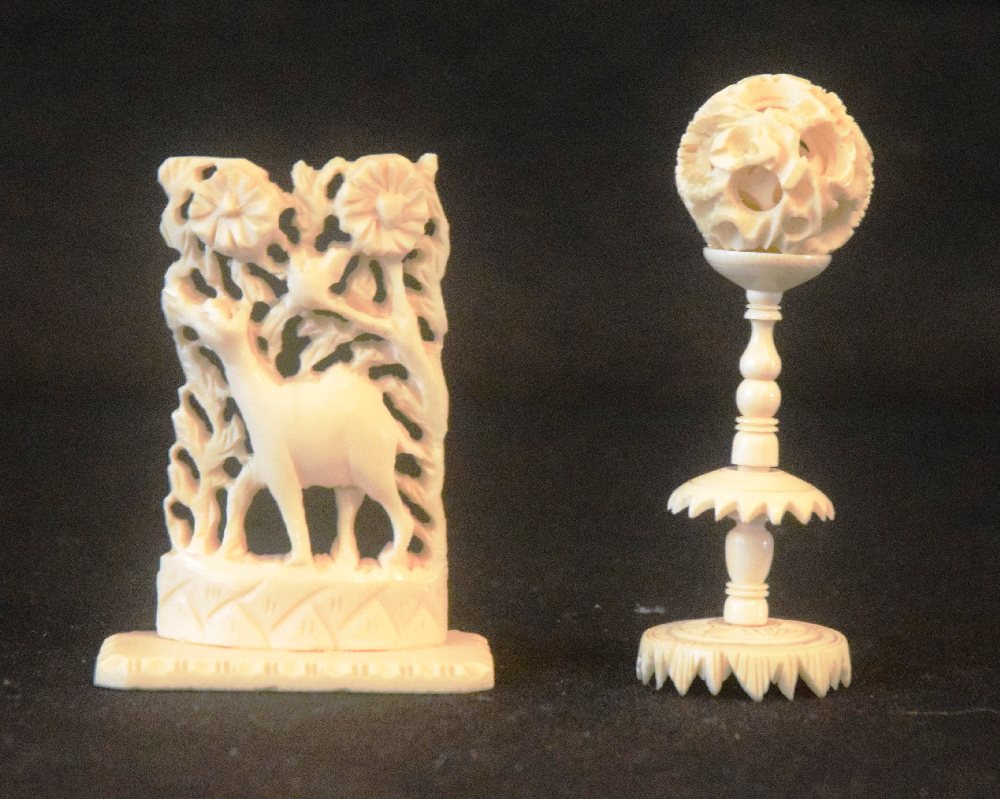 Early 20th C. Ivory carved concentric balls, 10cm; and carved deer, 8.5cm