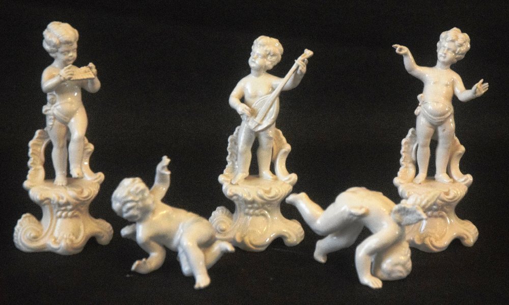 CAPO di MONTE 3 cherub musicians, 15cm; and 2 somersault angels, 9cm