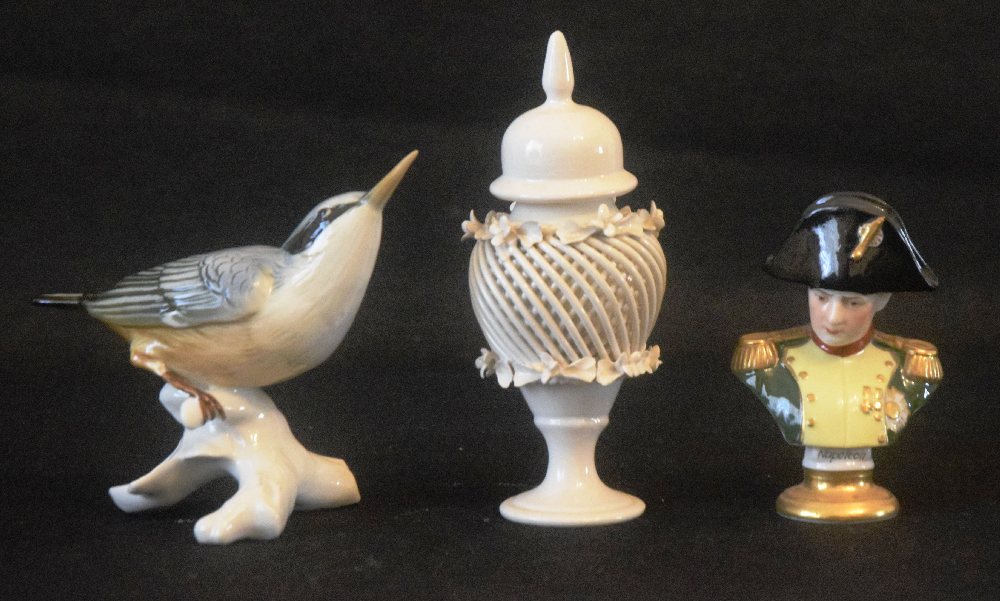 WALLENDORFER porcelain bird, CAPO DI MONTE creamware porcelain jar and cover; KAISER porcelain Napoleon