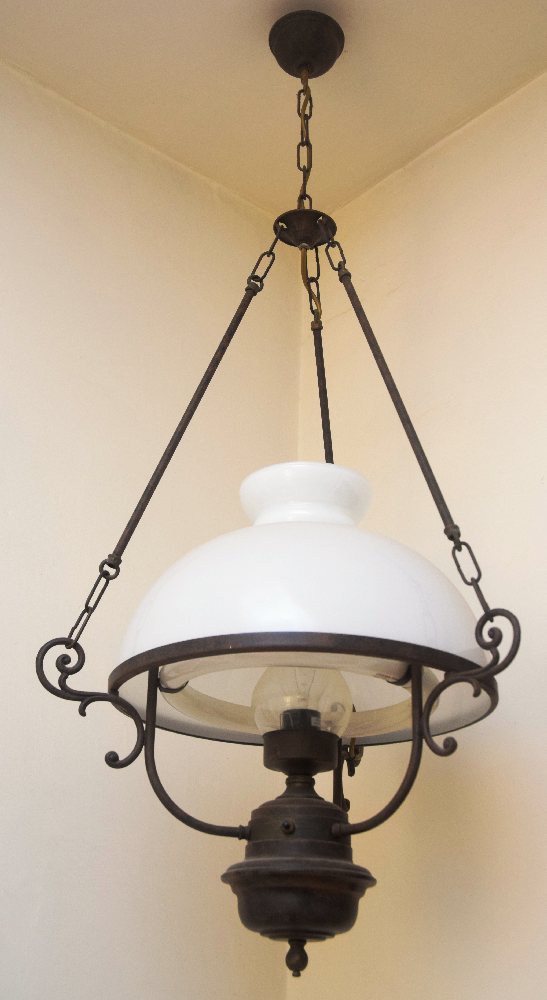 Late 19th C. 4 arm chandelier with suspended bead chains and prisms, 115cm
