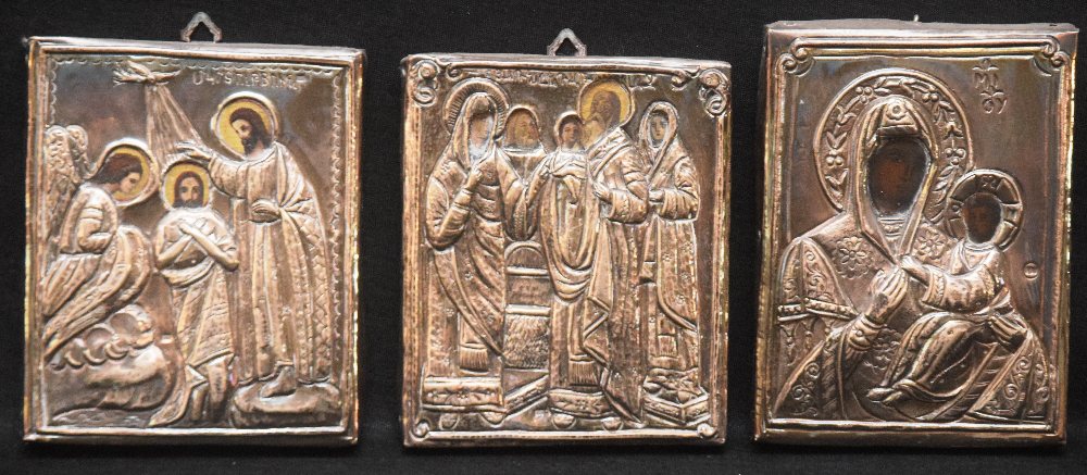 Icon with silver oklad; mini icon; and 19th C. Russian orthodox bronze travel icon; brass cross
