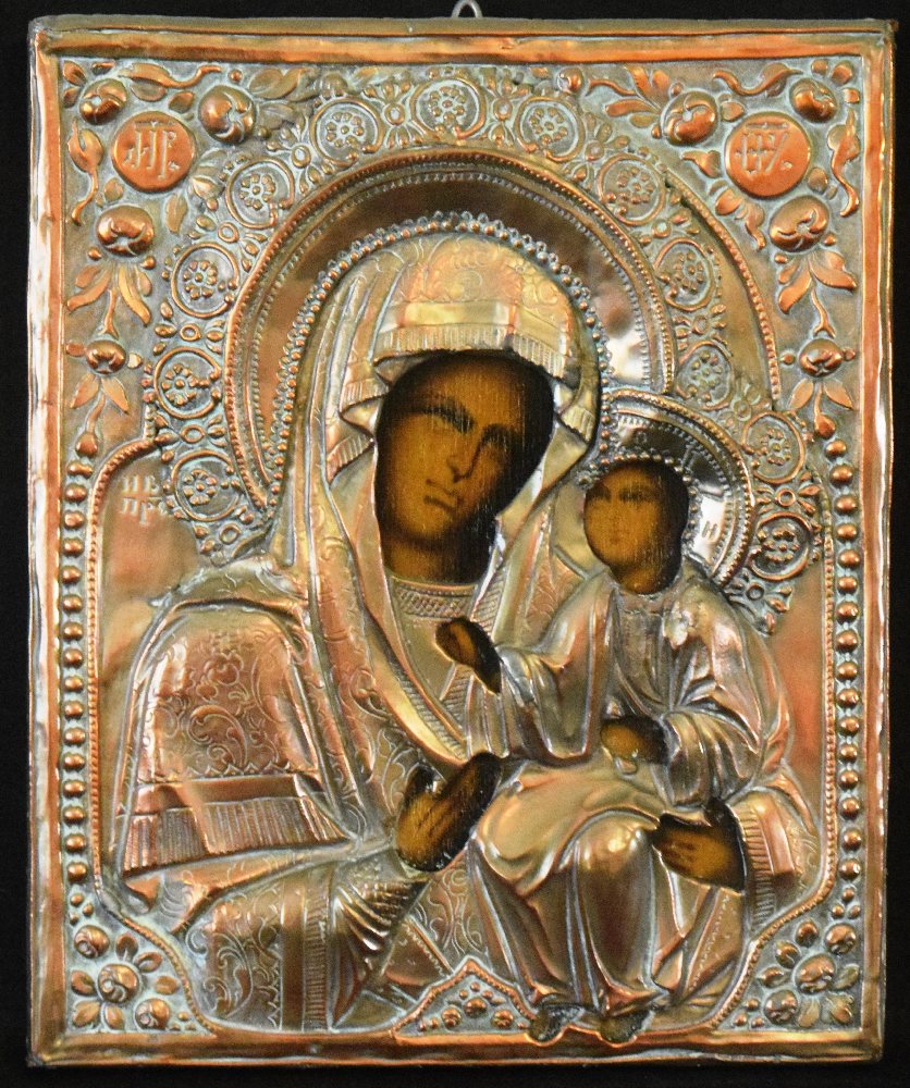 Icon of the Virgin and Child with silvered on copper embossed oklad, 27 x 32cm