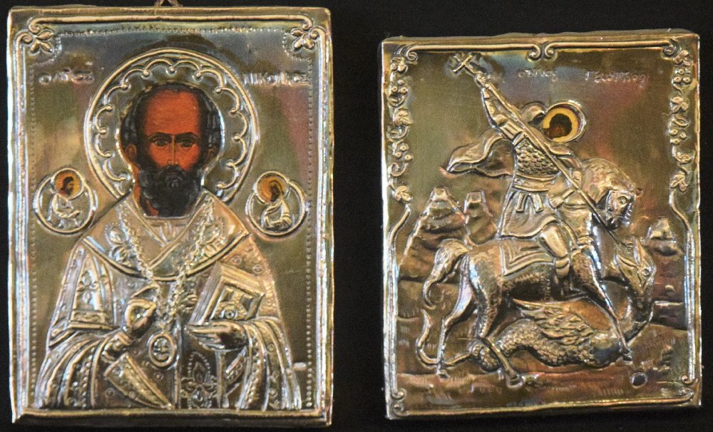 2, Silver oklad icons: St Michael and St Nicholas, 15 x 18cm