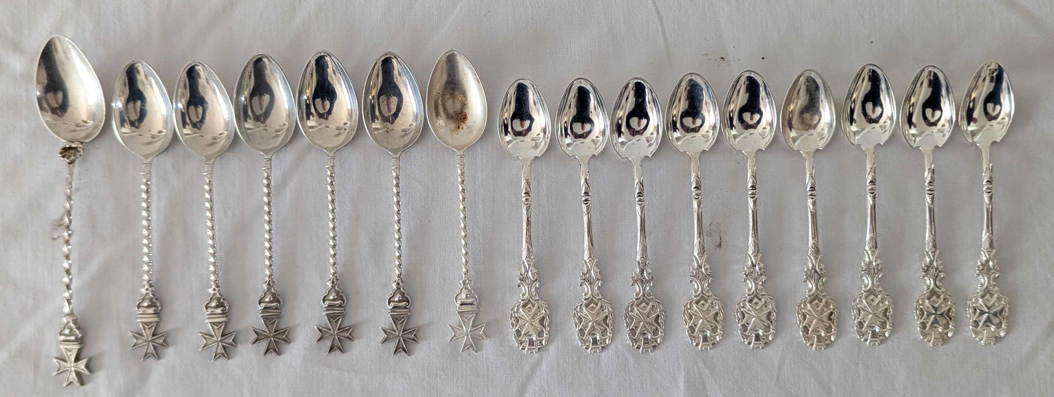 7, Maltese silver coffee spoons with cross terminals, 70gms; and 9 silvered coffee spoons with cross terminals