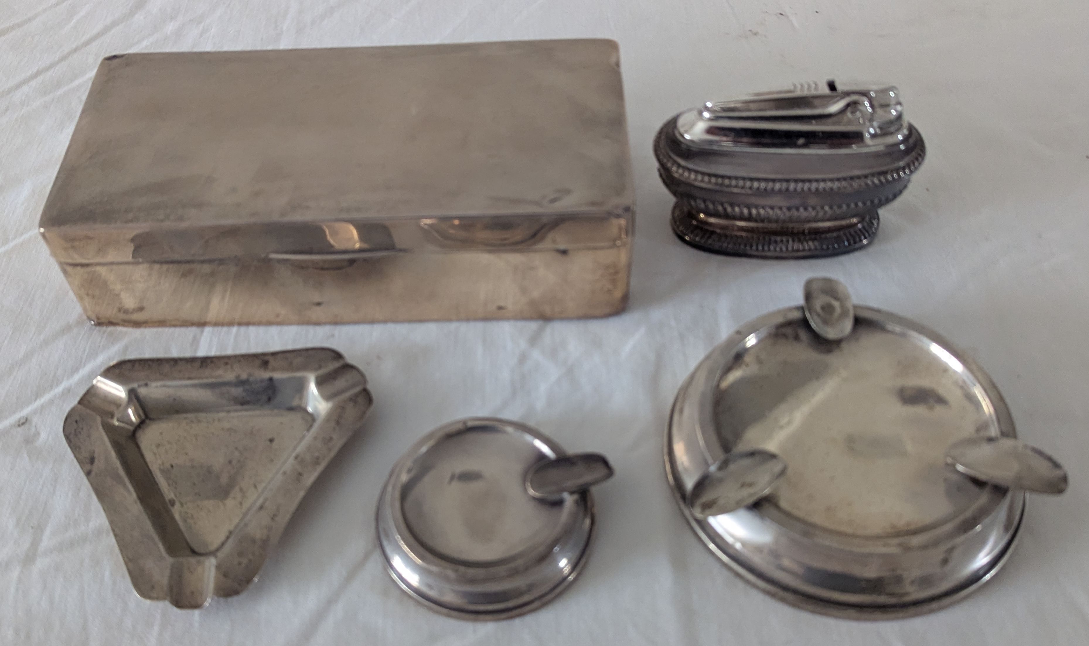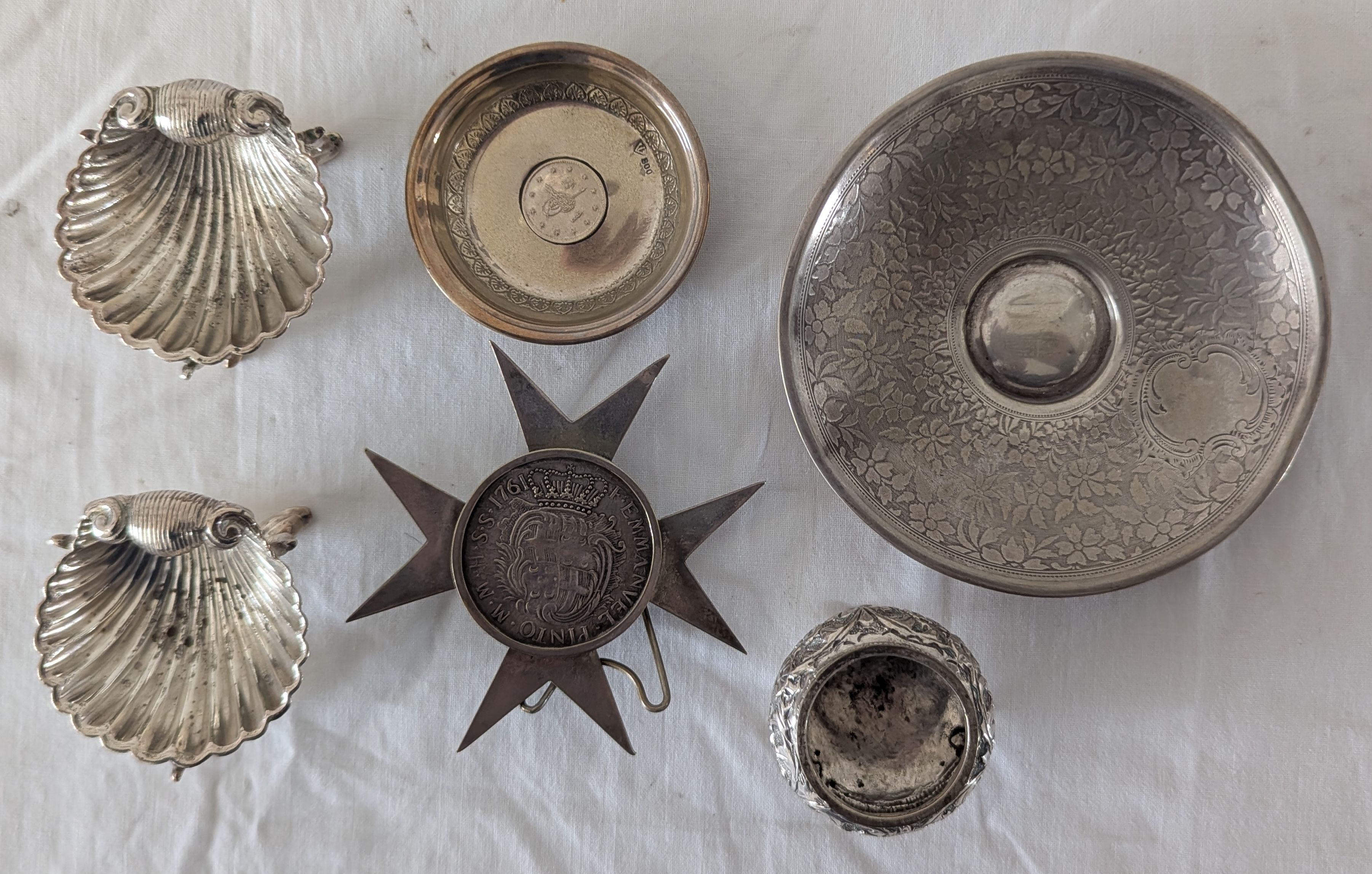 Silver name tag holder with inset coin; 2 pin trays; 2 silvered scallop shell salts