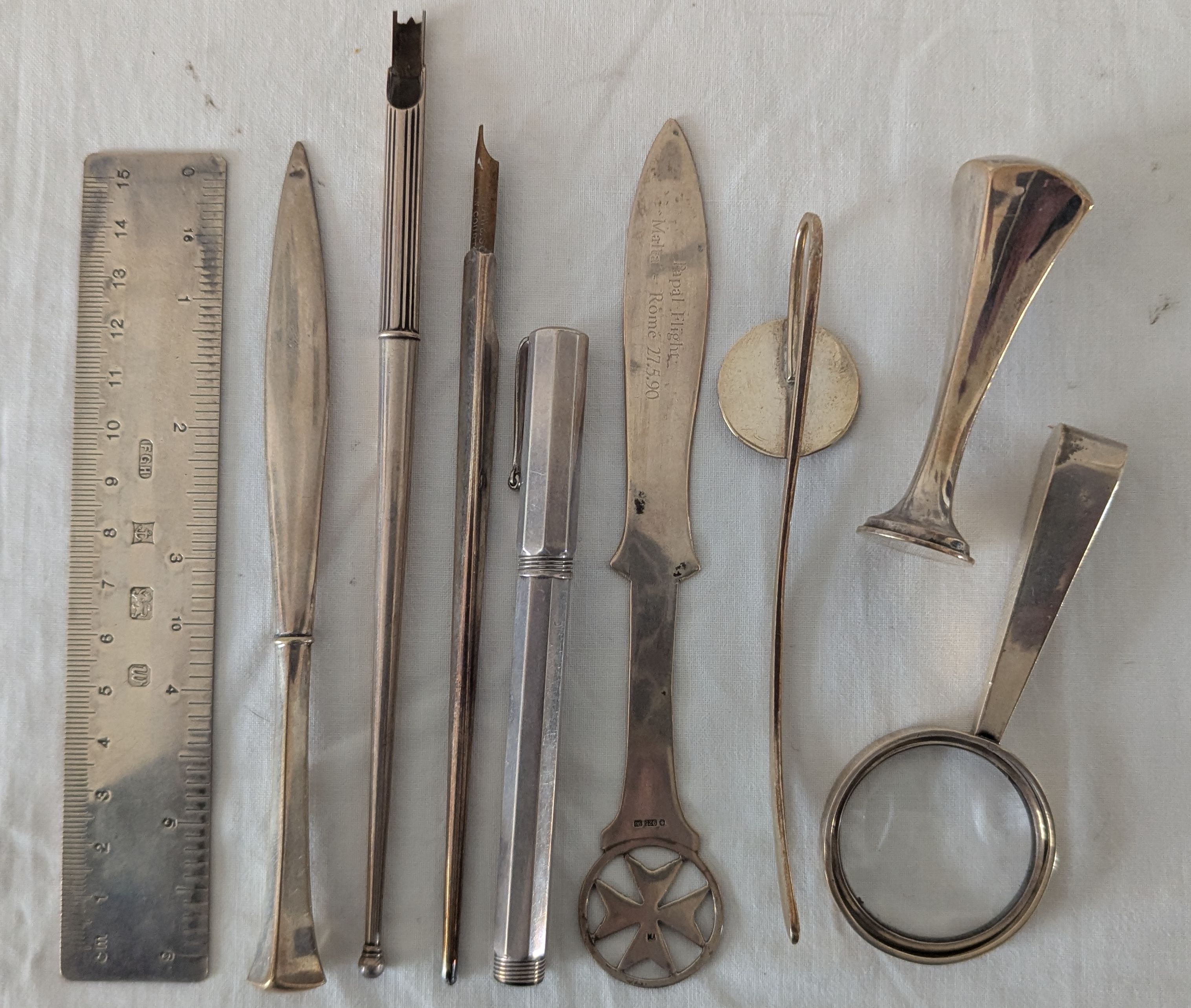 Silver 2 paper knives; 3 pens; 6″ ruler; seal and magnifier