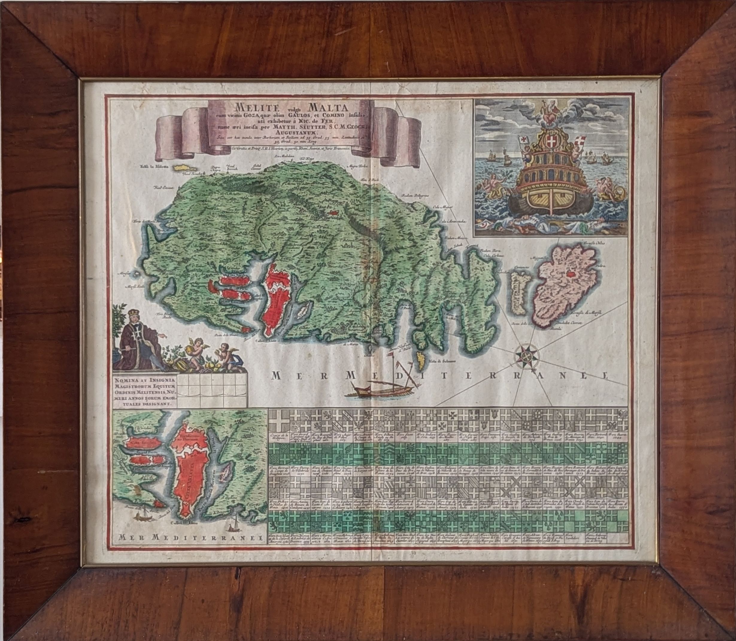 MATTHEUS SEUTTER 18th C. map of the Maltese Islands, in 19th C. Maltese mahogany frame