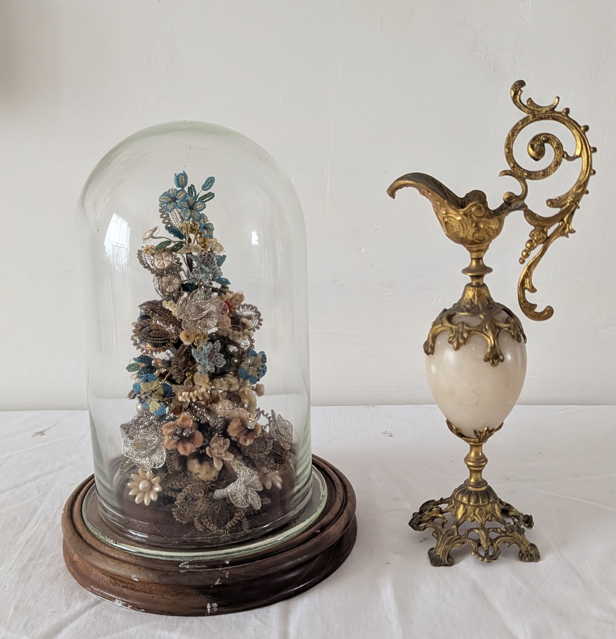Ganutel floral work bouquet under glass dome; alabaster and brass jug