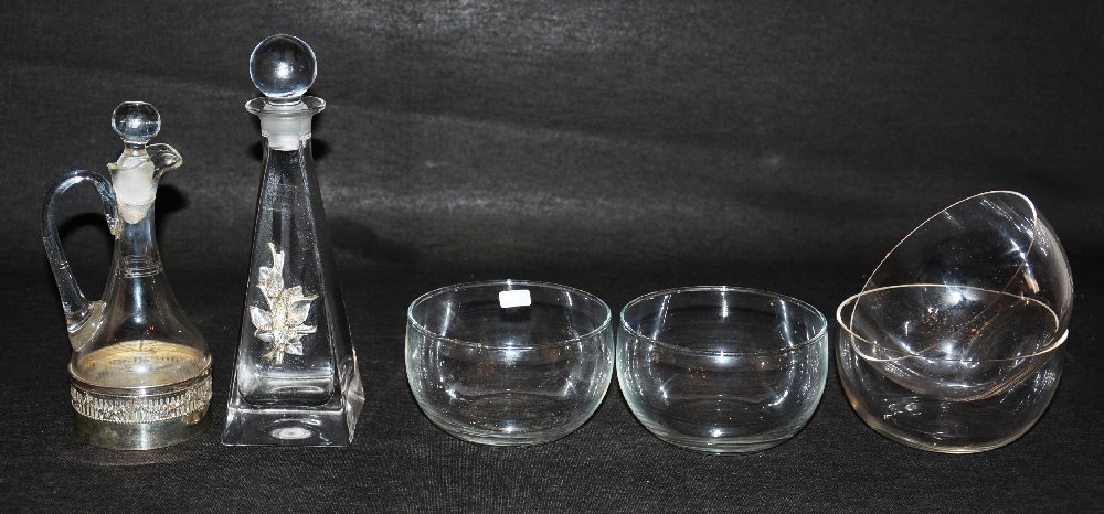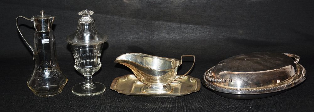 Silver plated oval entree dish, oil bottle and sauce boat, crystal jar and lid