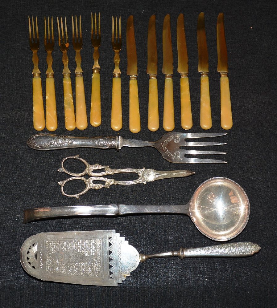 Silver plated cake slice, ladle, serving fork, grape scissors, 6 fruit knives and forks