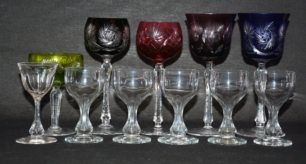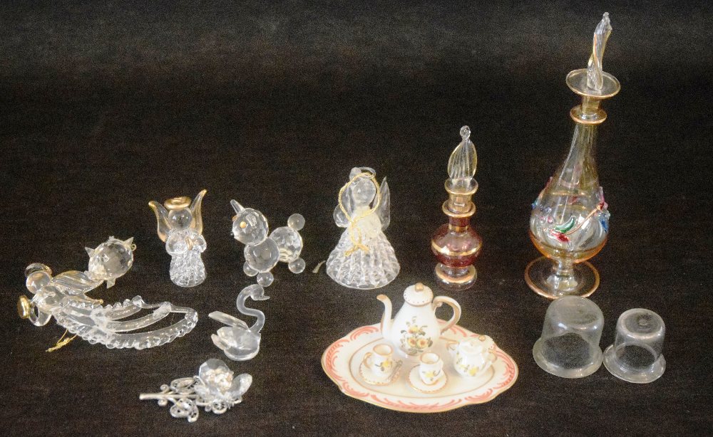 Miniature dolls tea service on tray; 2 perfume bottles and 7 glass miniatures