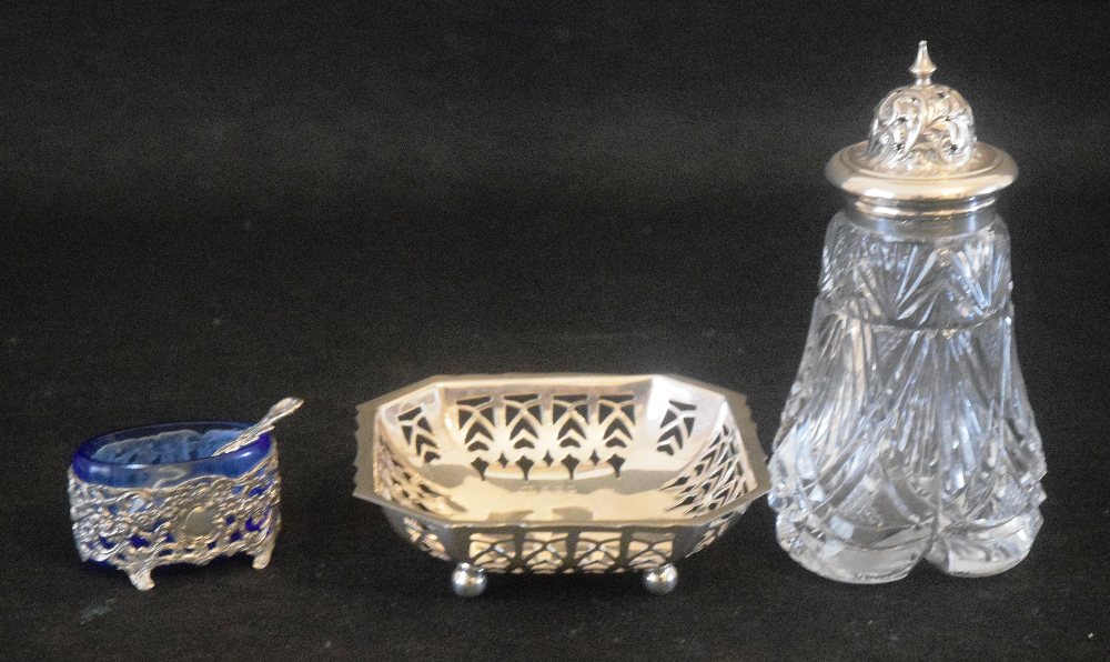 English silver square bonboniere, crystal caster with silver top