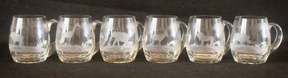 6 Fine crystal beer pint mugs with finely engraved African animals