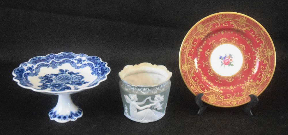COVERSAL porcelain cabinet plate, German porcelain blue & white cake stand, and Wedgwood green rose bowl