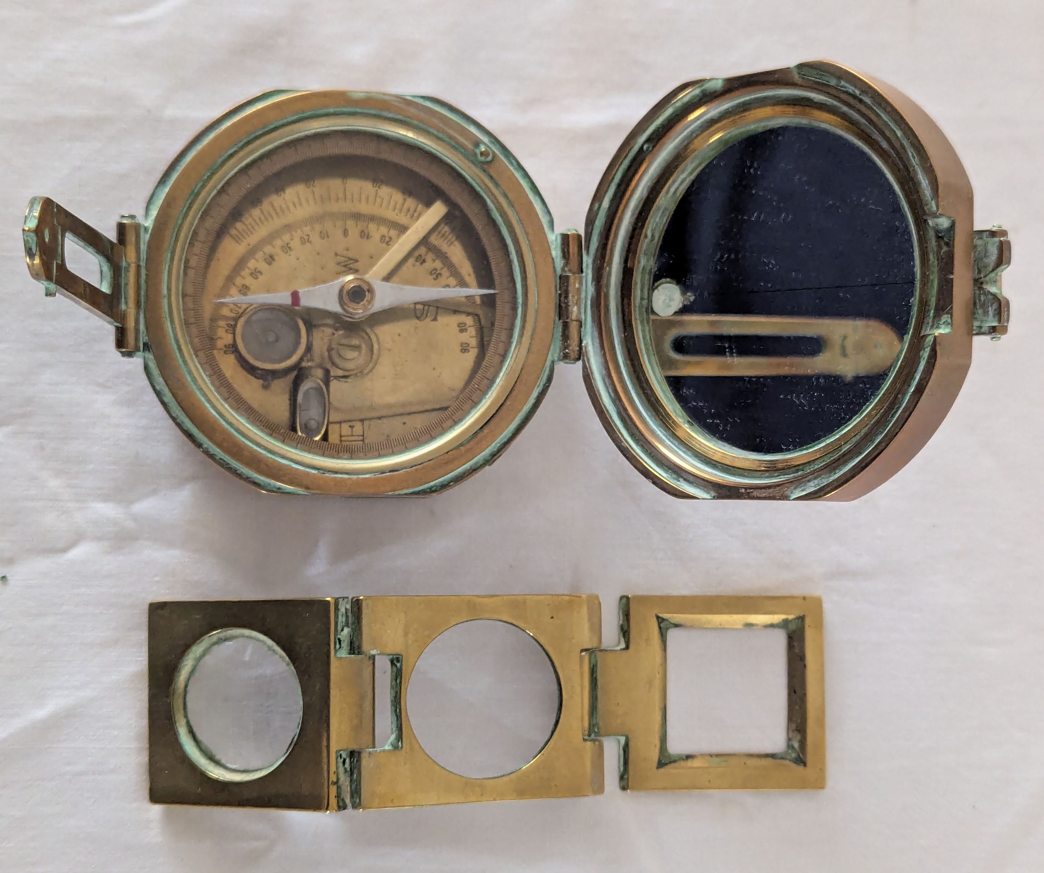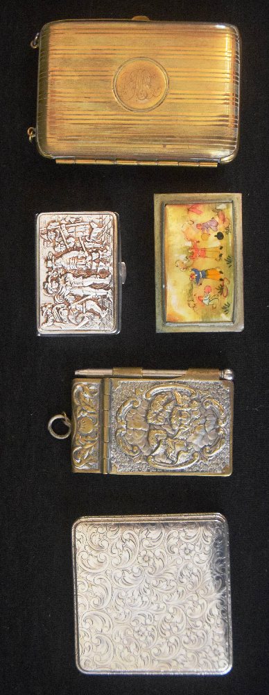 Metal cigarette case with coin compartments; note book case; compact and 2 pill boxes