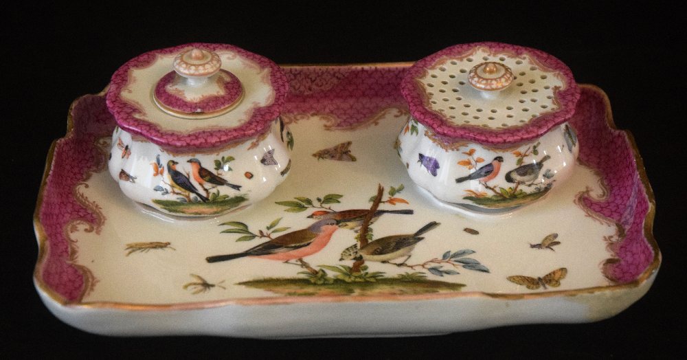DRESDEN porcelain standish with 2 pots, painted with birds (d )