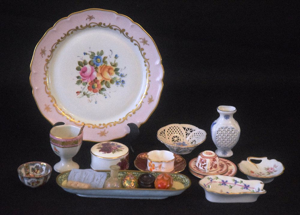 LIMOGES porcelain plate, eggs, cups, saucers, pill box and other miniatures