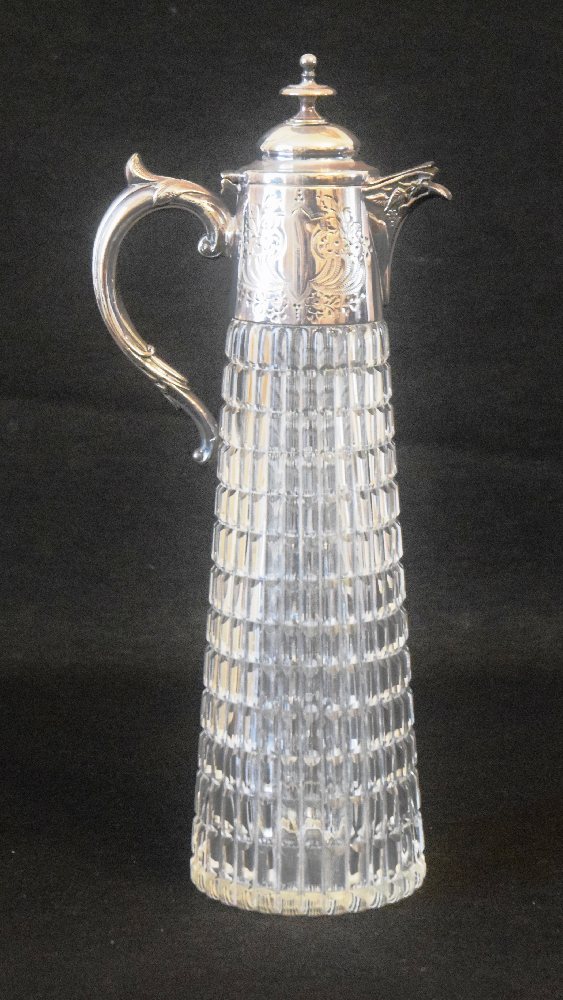Cut crystal claret jug, silver plated engraved collar and handle, 34cm