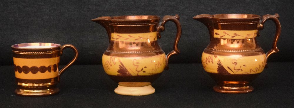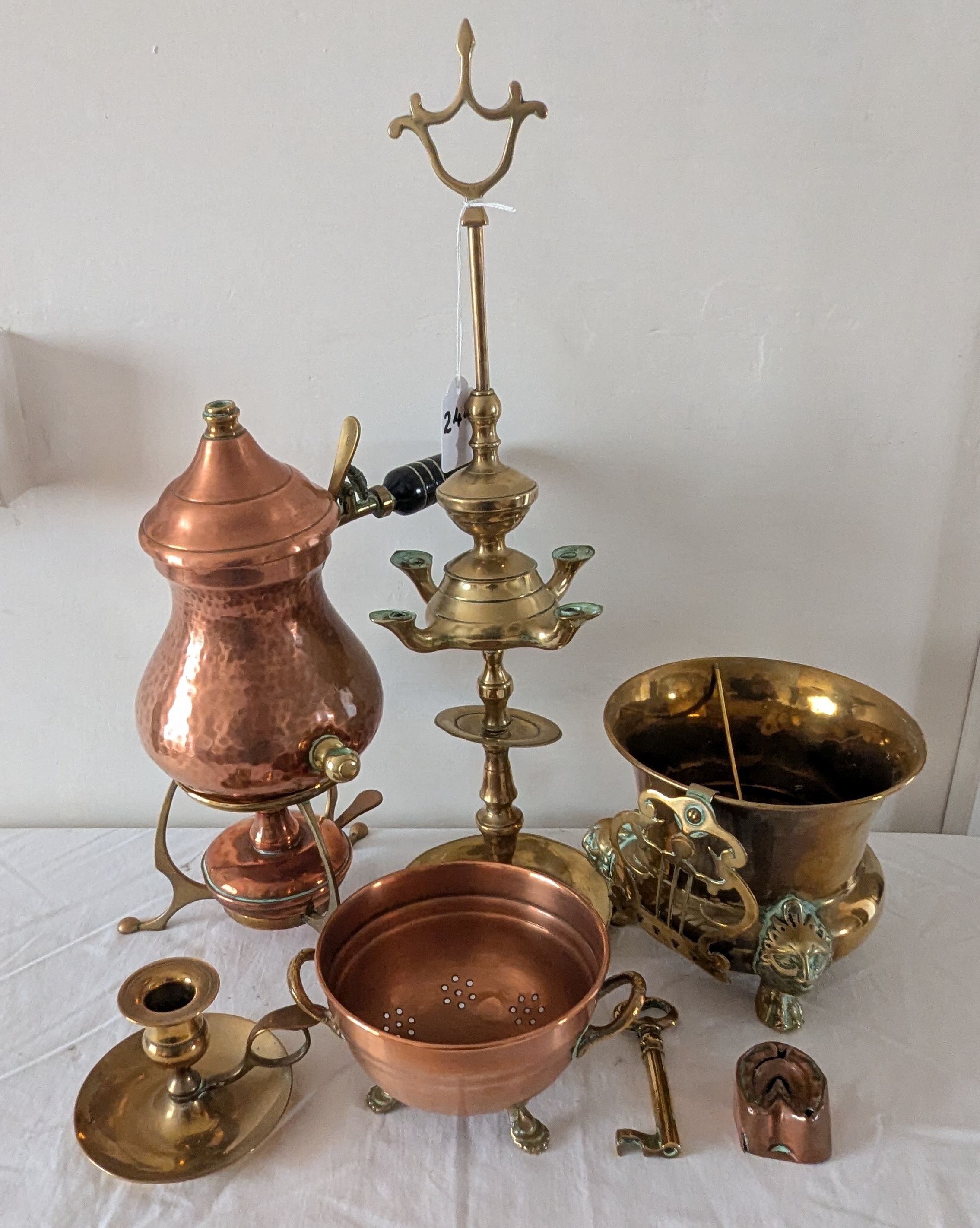 Brass planter; library oil lamp; chocolate pot on warmer; sieve, key, etc