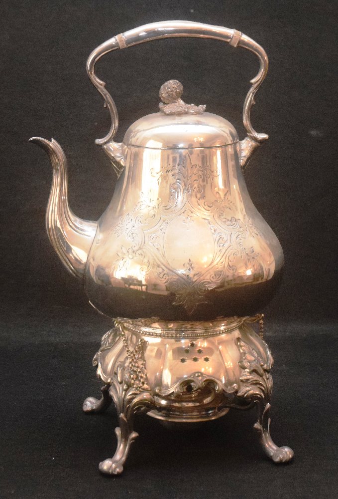 Victorian Brittania metal baluster kettle on warming stand, engraved decoration, 40cm