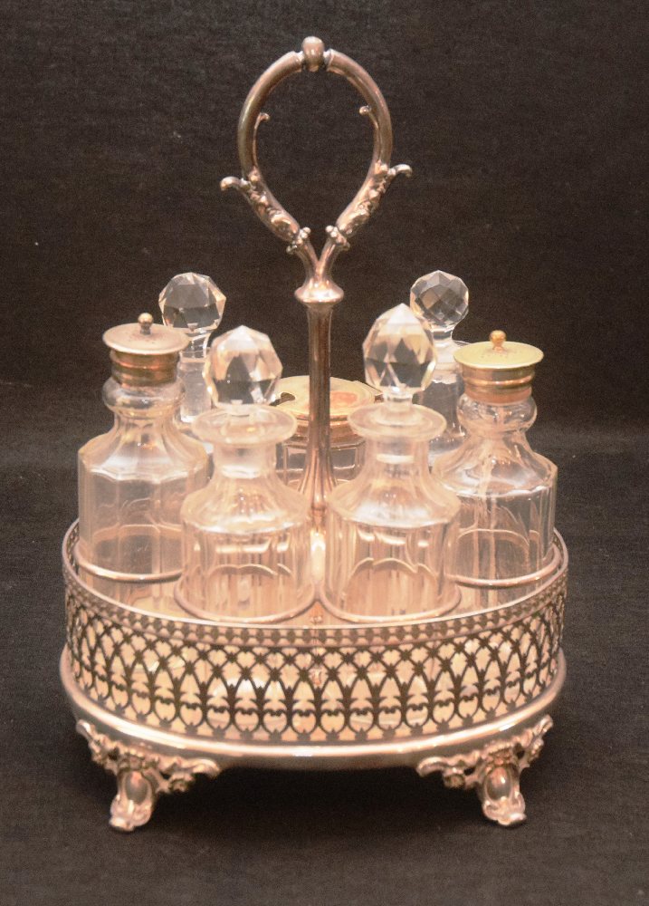 Edwardian silver plated cruet stand with crystal bottles