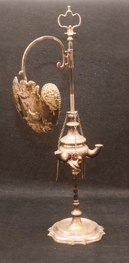 Edwardian silver plated 3-burner library oil lamp with screen and tools, circular base, 58cm