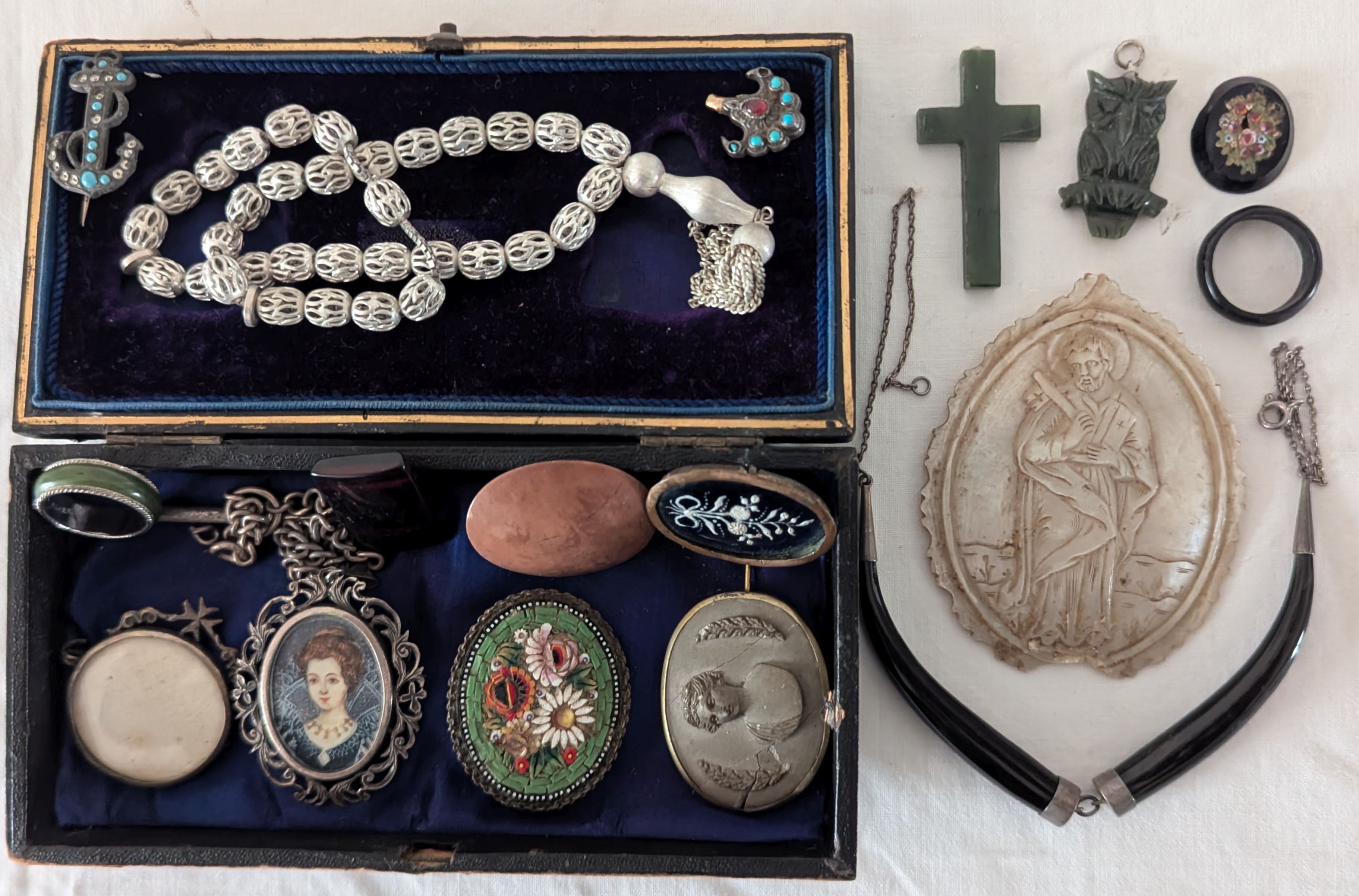 19th C. mother of pearl carved plaque of St Peter (d); 4 old brooches; silver necklace and smalls