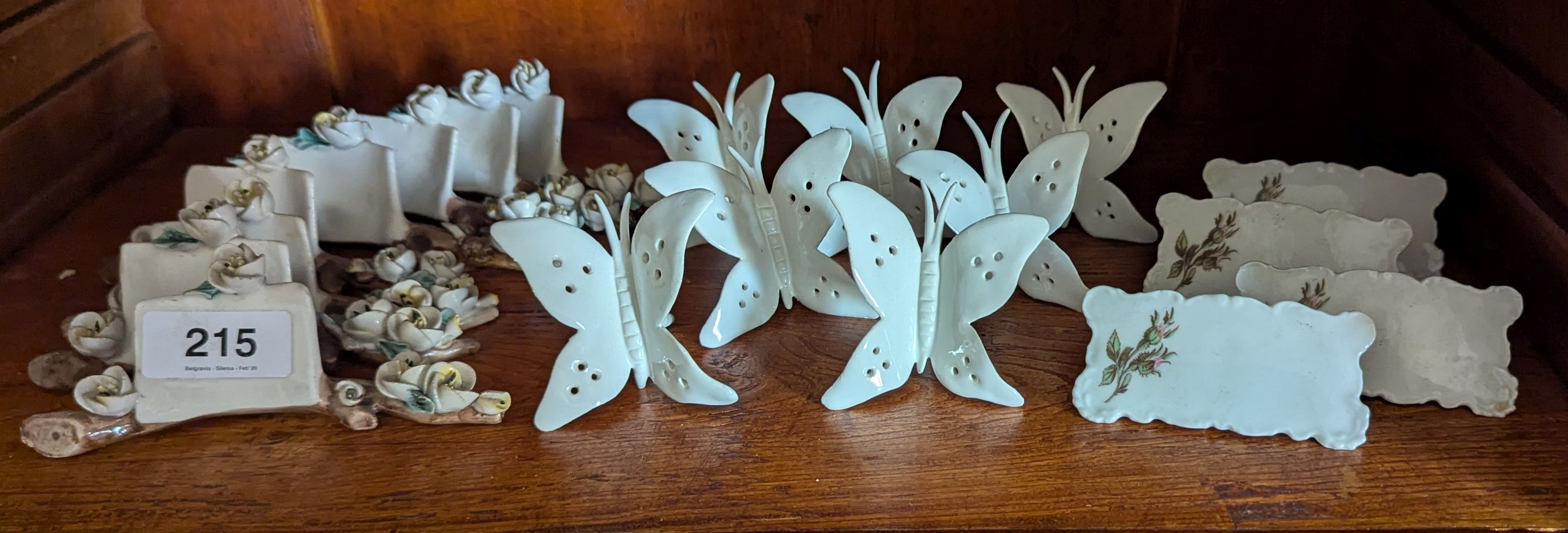 8 Ceramic name tag stands; 4 CAPO DI MONTE name tag plaques; 7 china white butterflies