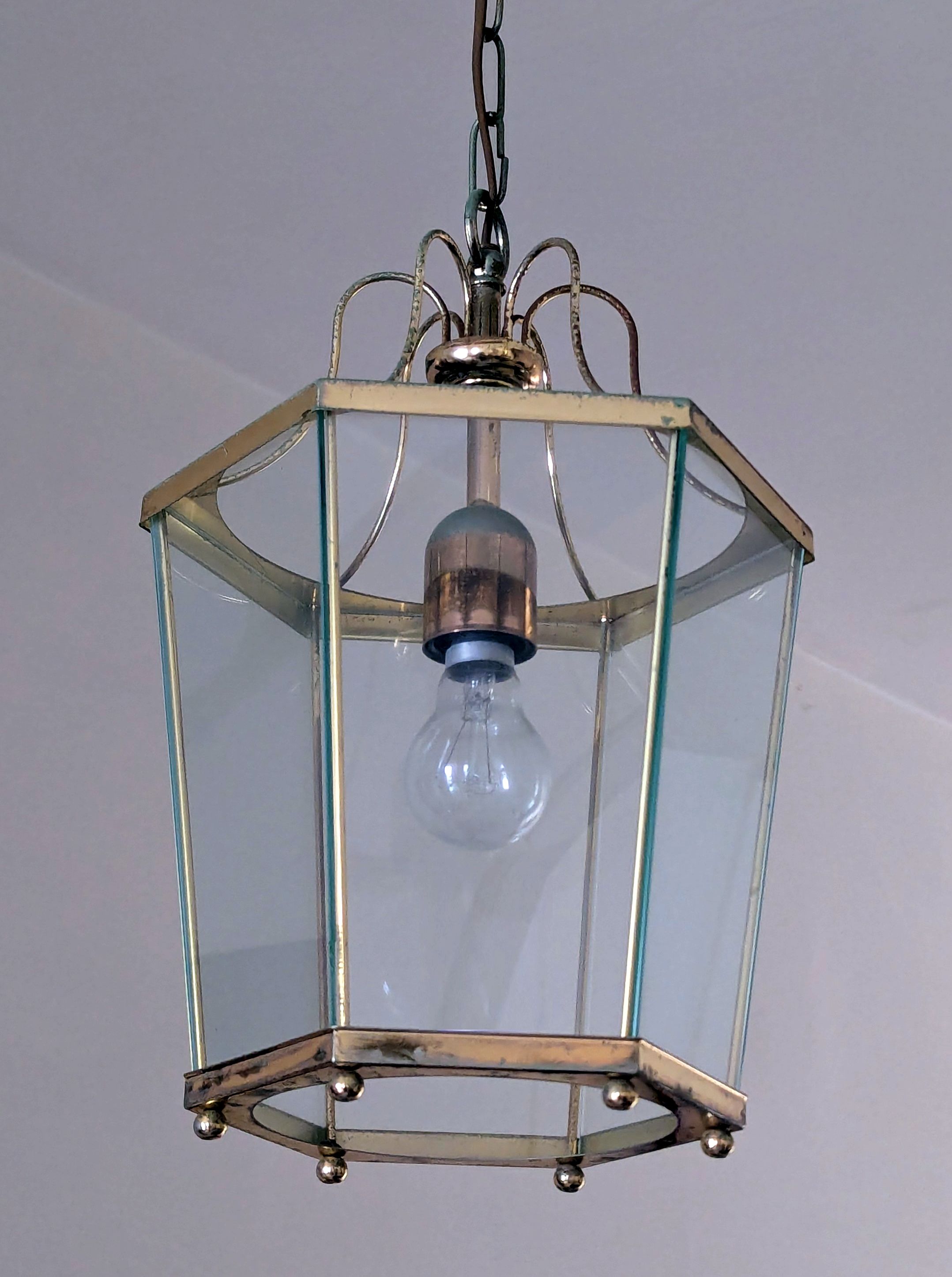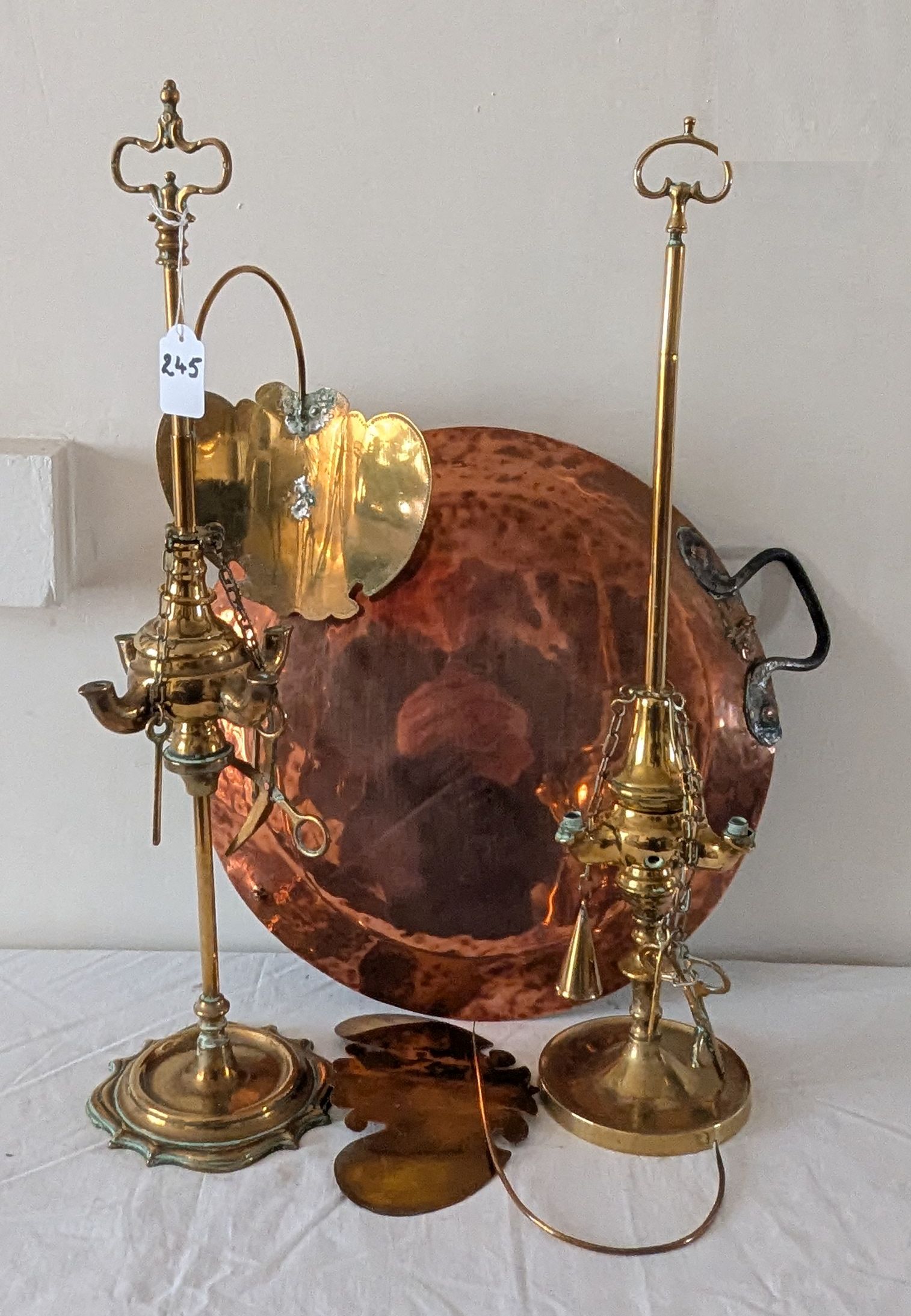 2, Late 19th C. brass library oil lamps with screens and suspended tools