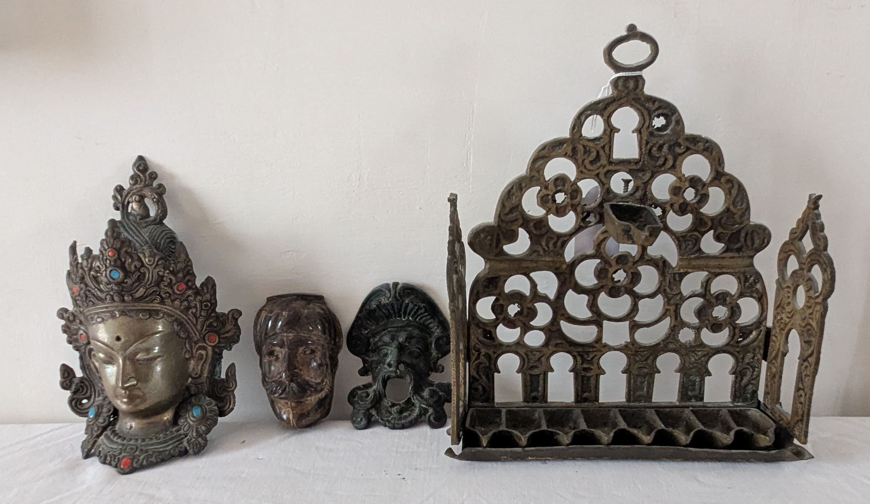 19th C. Moroccan brass Hanukkah lamp (Menorah) oil lamp, 20cm; THAI bronze mask, etc