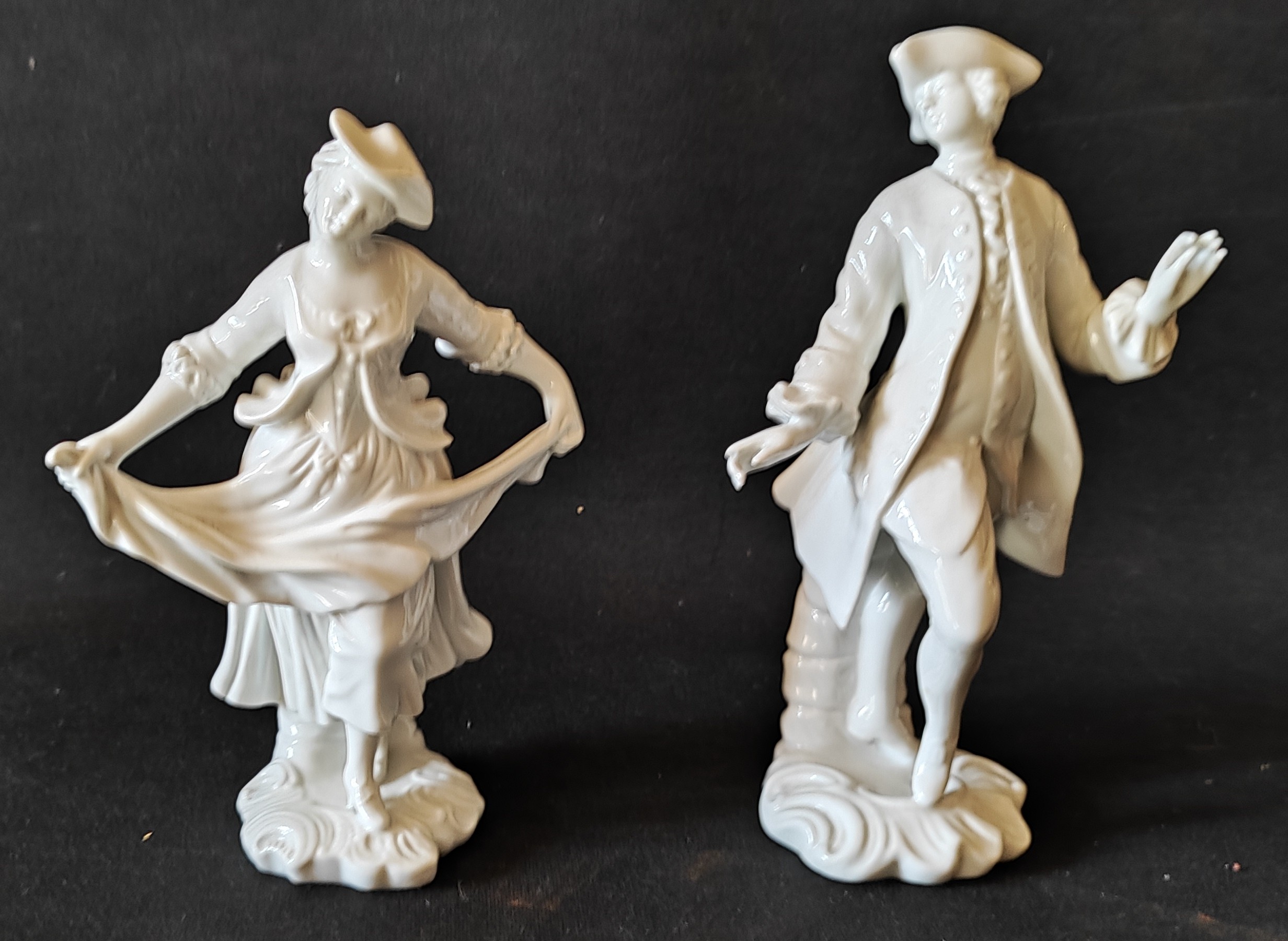 GINORI blanc de chine porcelain pair figures: Courtiers, 17 & 18cm