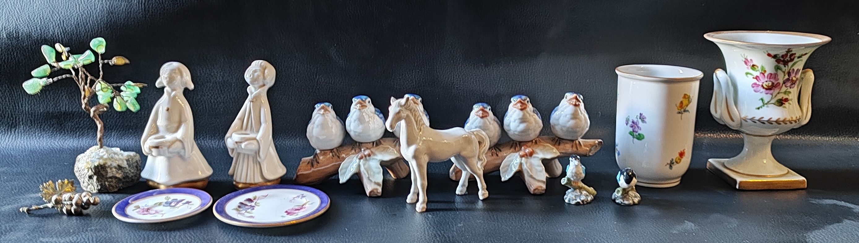 DRESDEN porc elain cocktail stick vase; CAPO DI MONTE small urn vase; 2 porcelain birds on branches, blanc de chine horse and ornaments