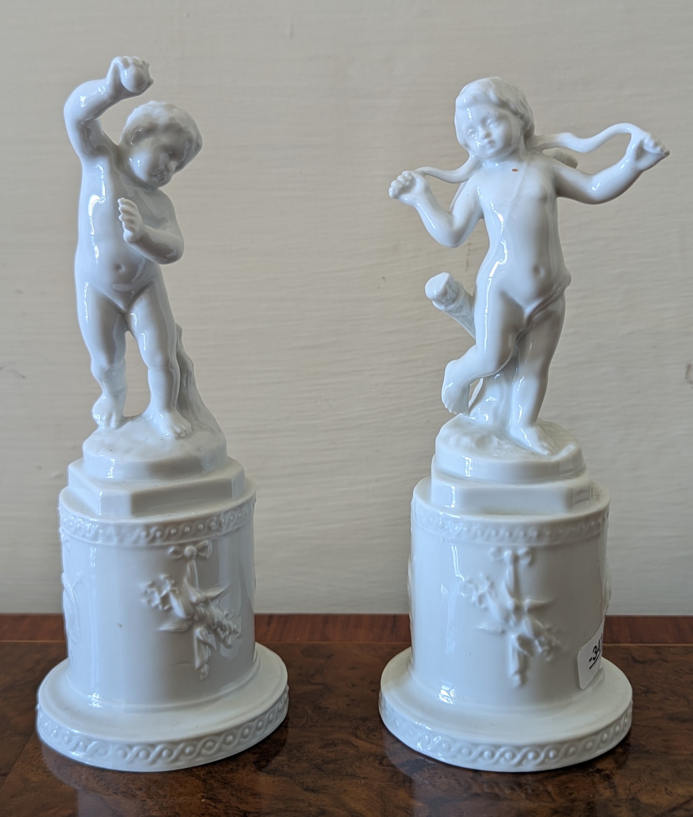 GINORI blanc de chine porcelain pair sporting cherubs, 14.5cm
