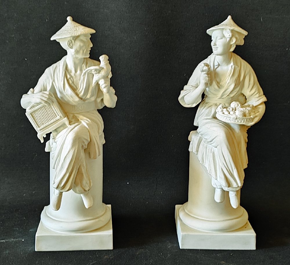 WORCESTER parian porcelain pair figures with square bases modelled by A AZORI: La Fleur and L’Oiseau, 30cm