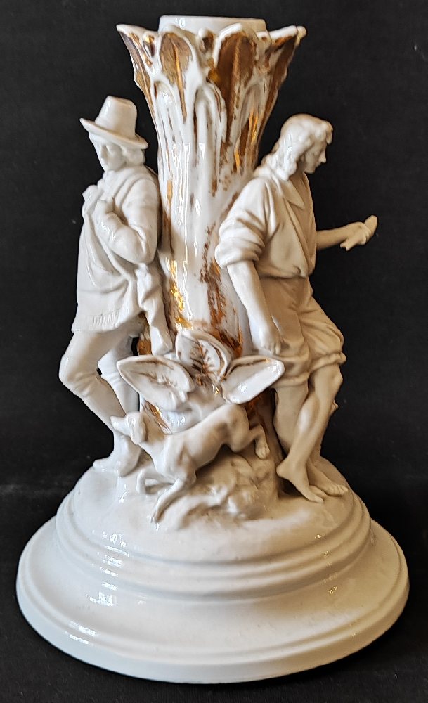 Mid 19th C. China candleholder with hunter and fisherman, circular base, 22cm