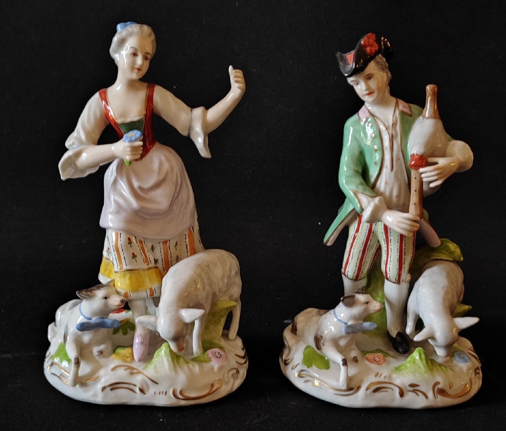 Capo di Monte pair porcelain figures of Country Girl and Companion with musical instrument and sheep, 16cm